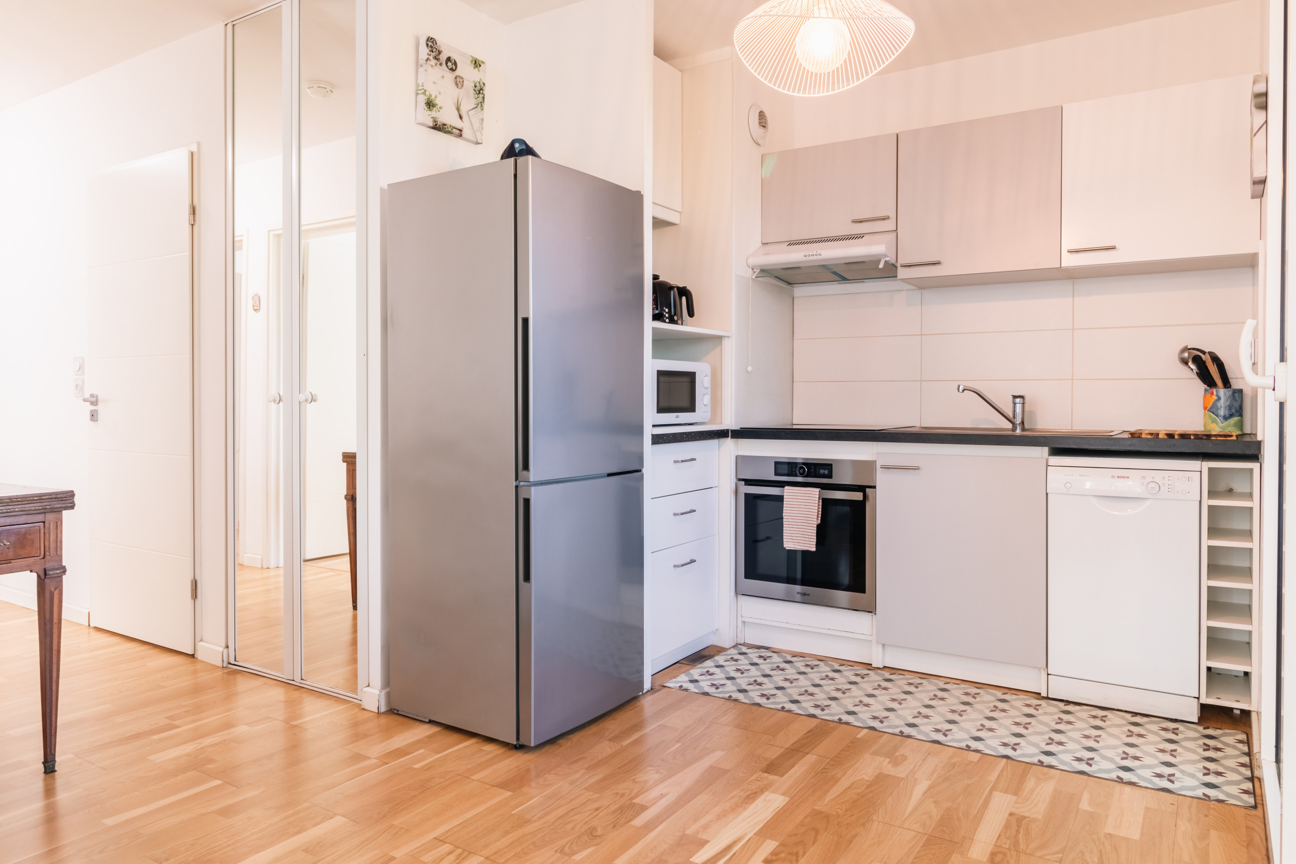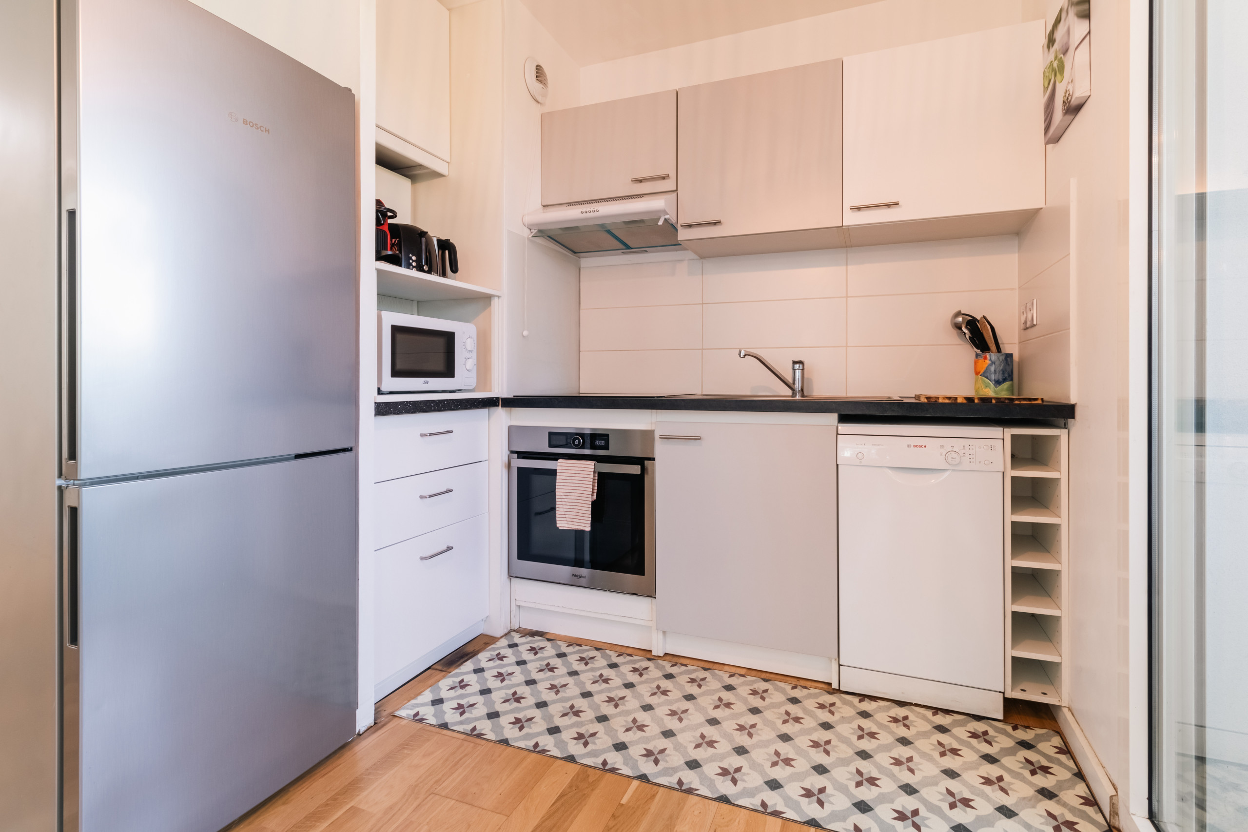 La cuisine américaine, à induction, est équipée avec réfrigérateur, micro-ondes, congélateur, vaisselle/couverts, ustensiles/cuisine, cafetière, grille pain et bouilloire.